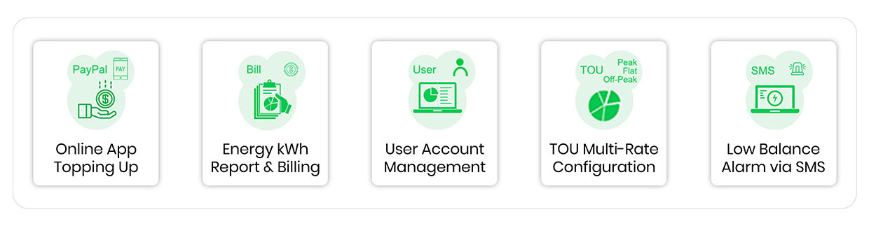 V řešení Acrel IoT EMS Billing Solution manažeři zařízení nastavují špičkové, mimošpičkové a ploché tarify TOU, prosazují předplacené nebo následné platby a definují prahy nízkého zůstatku. Uživatelé dobíjejí peníze přes PayPal, kreditní kartu nebo mobilní aplikaci; platforma automaticky odesílá SMS alarmy, vystavuje PDF účty a plánuje vzdálené odpojení s nulovým kreditem. Řídicí panely v reálném čase, dílčí měření nájemců a konfigurovatelné energetické zprávy zjednodušují soulad s ESG a alokaci nákladů.