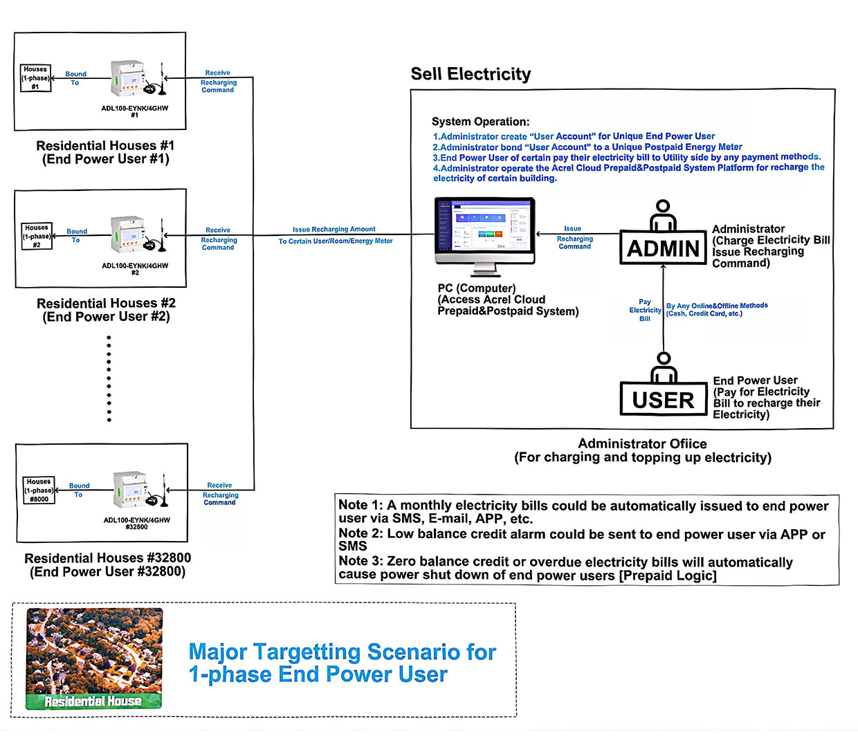 Komplexní předplacený/postpaid fakturační systém Acrel je účelově vytvořen pro školní koleje, nákupní centra, průmyslové parky a rezidenční sídliště. Třívrstvá architektura začíná inteligentními elektroměry ADL100-EY (jednofázové) a ADL300-EY (třífázové); každý integruje 100A magnetické relé, podporuje DL/T 645 a Modbus-RTU a zaznamenává kWh s přesností třídy 1.