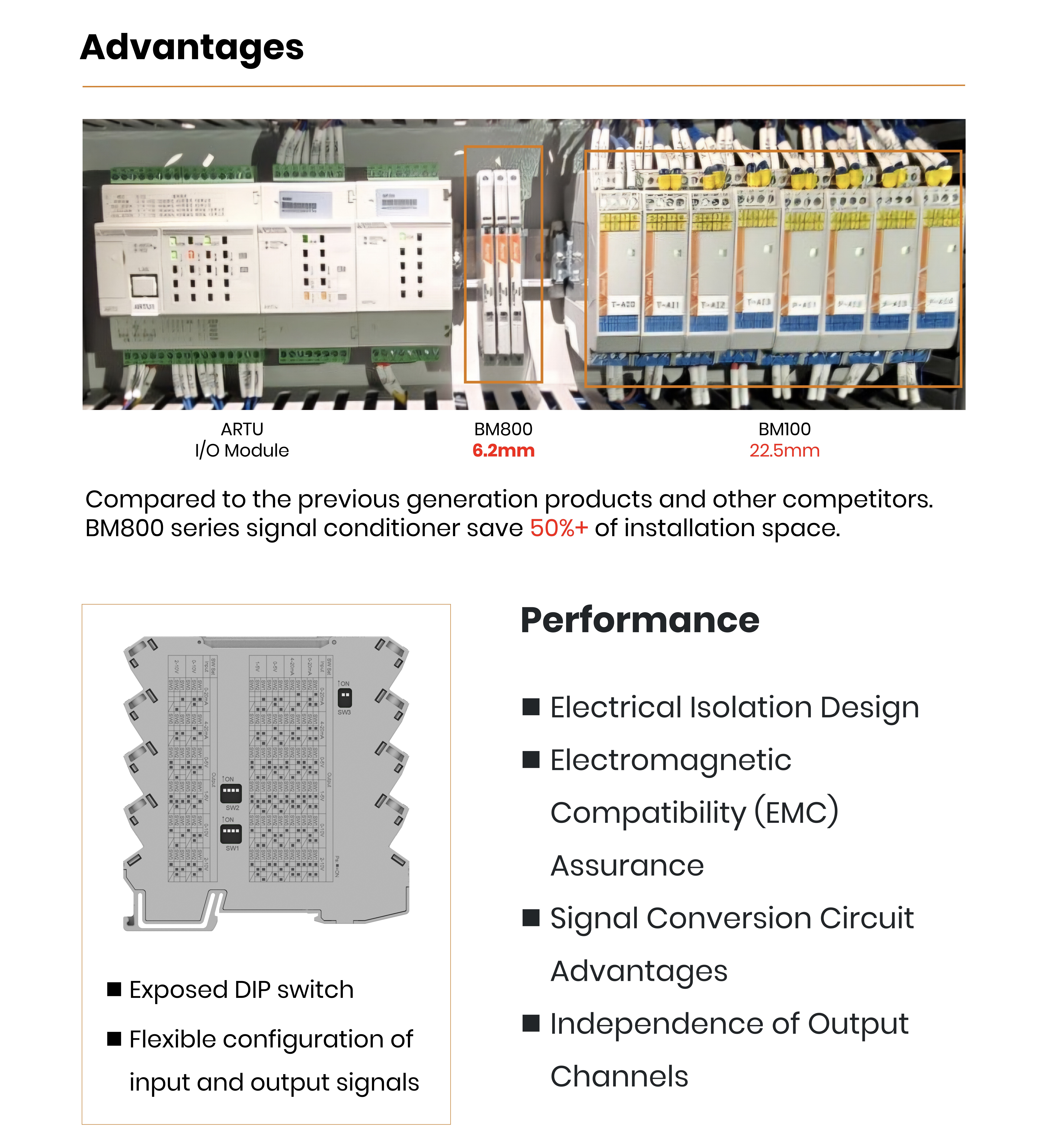 Kondicionér signálu řady BM800, známý také jako izolátory signálu, převodníky signálu a převodníky signálu, je pokročilé průmyslové zařízení pro úpravu signálu se super tenkým 6,2 mm designem, které šetří více než 50 % instalačního prostoru. Může se pochlubit přesností 0,1 %, zárukou elektromagnetické kompatibility a funkcemi, jako je elektrická izolace, výhody obvodu pro konverzi signálu a nezávislé výstupní kanály. S DIP přepínačem pro flexibilní konfiguraci vstupního a výstupního signálu může zpracovávat různé signály jako 0/4~20mA, 0/1~5V atd. Má také vynikající výkon v teplotním driftu, době odezvy a izolační síle.